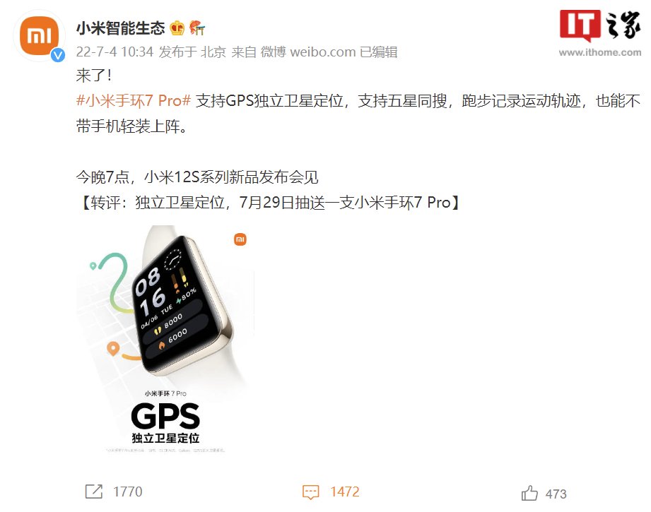 IT之家 7 月 4 日消息,今日,小米官方表示,小米手环 7 Pro?支持 GPS 独立卫星定位,支持五星同搜,跑步记录运动轨迹,也能不带手机轻装上阵。
