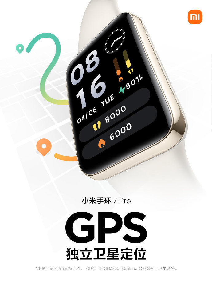 官方海报显示,小米手环 7 Pro?支持北斗、GPS、GLONASS、GALILEO、QZSS 五大卫星系统。